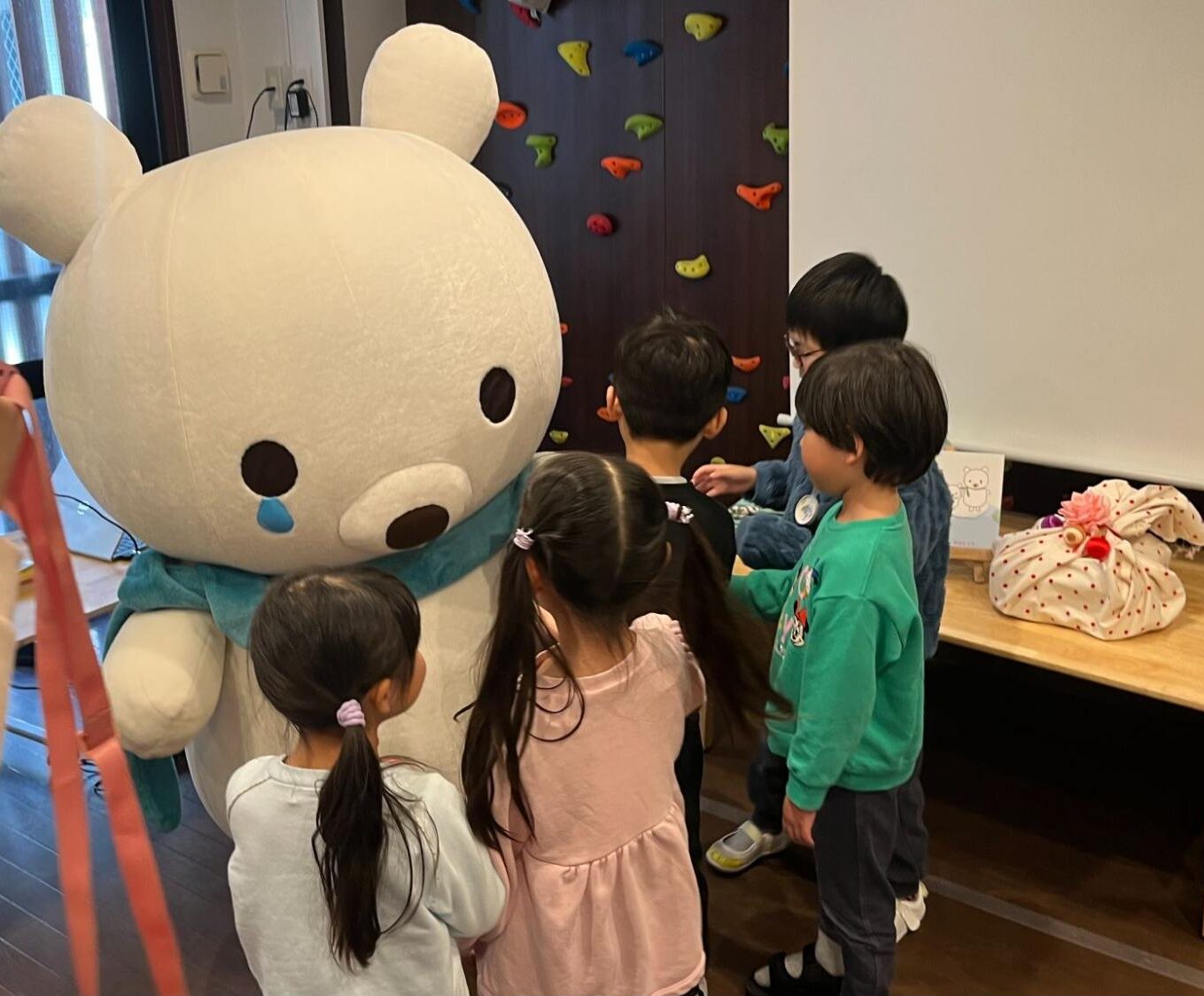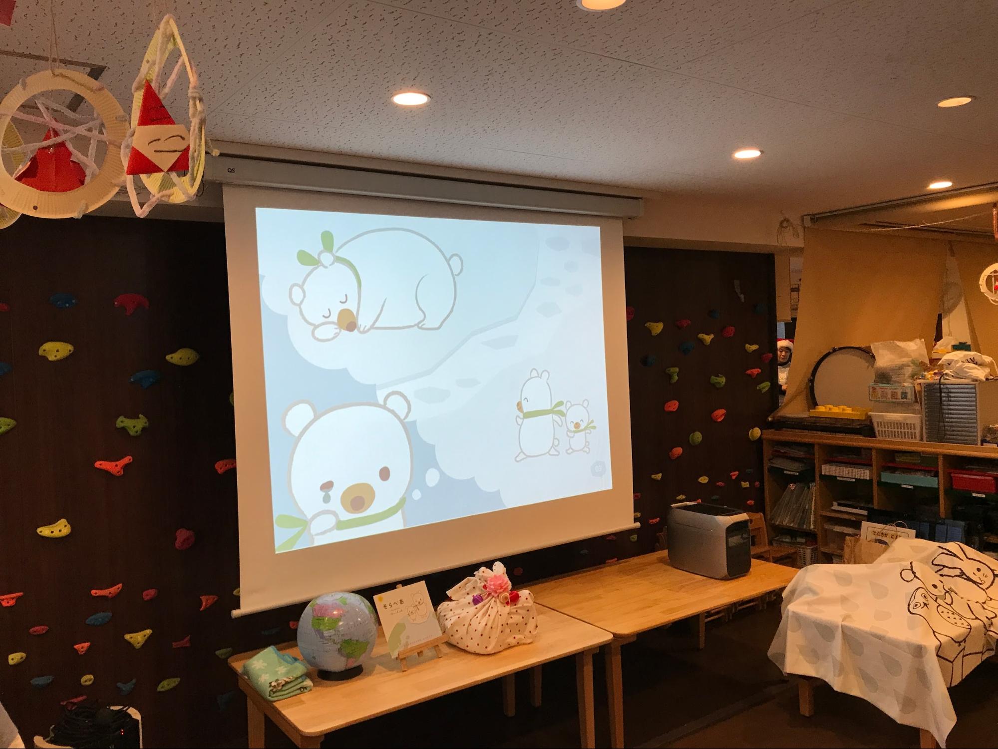 保育園の先生が、プロジェクターを使って「そらべあの物語」を通し